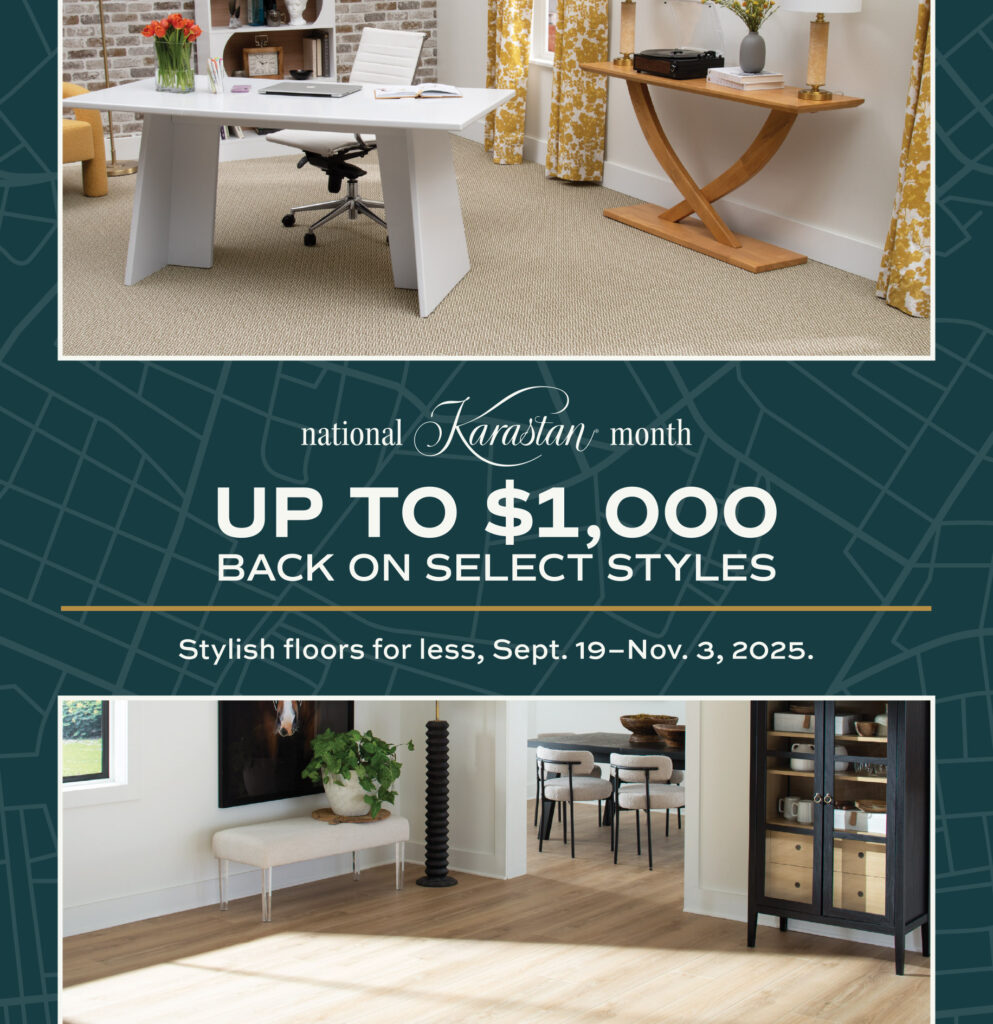It is National Karastan Month! Receive up to $1,000 back on select styles from now until November 3, 2025.